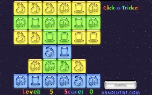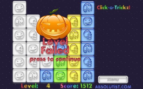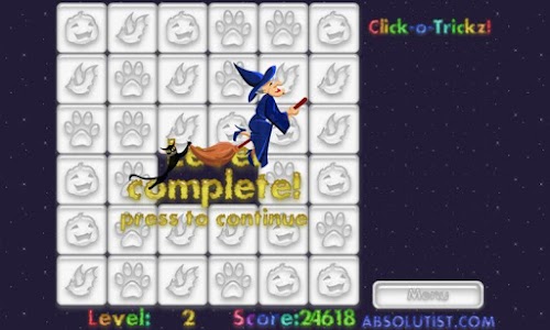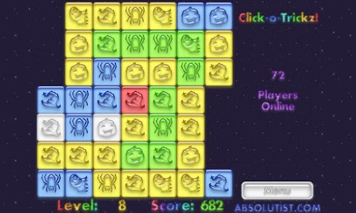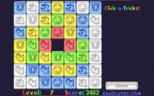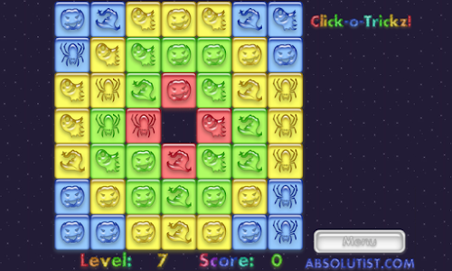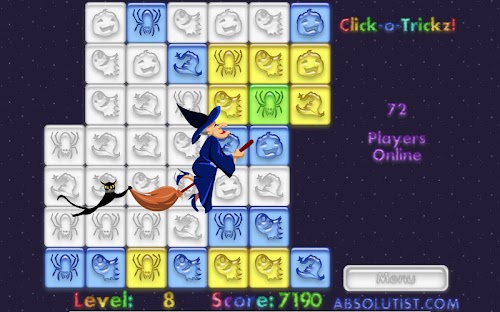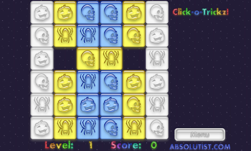 Spend this Halloween in the company of ghosts, vampire bats, spiders and other creepy creatures. Click-o-Tricks: Halloween Maze is your trapdoor to the world of haunted fun. Join our coven on the way through multiple click and pop levels in an exciting Match 3 puzzle. Change the tiles color to white tapping the groups of three or more similar images. Your matching and logic skills will be rewarded with a generous treat by a witch flying in the dark autumn sky. So do your best and mind your every move, or the Jack-o'-lantern will play tricks on you.