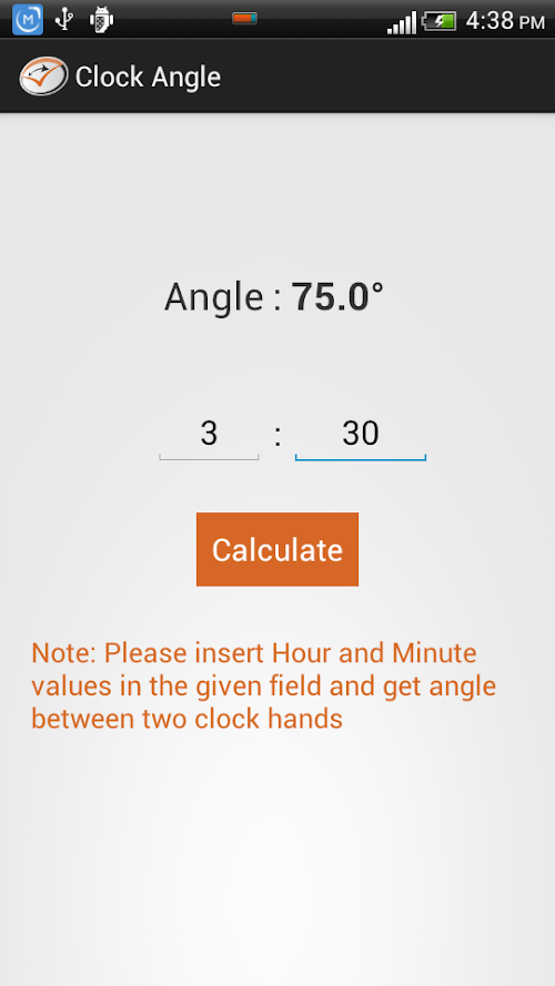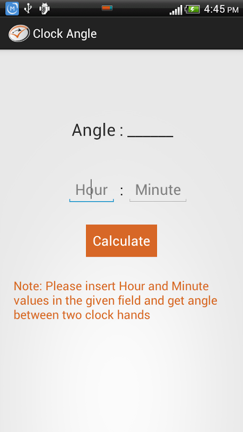 Just put hour and minute values in given fields and calculate angle on a single tap.