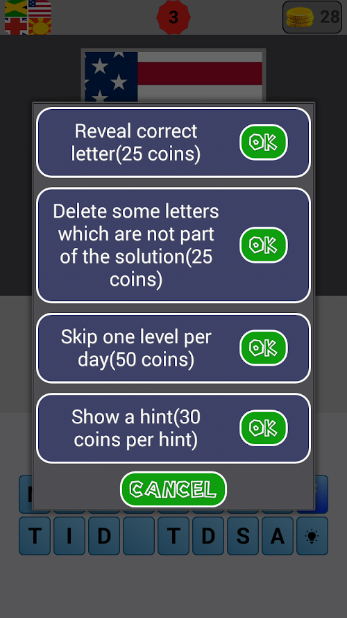 If you are stuck then reveal the letters of the country name,remove irrelevant letters or ask for up to 2 hints to the country using coins.