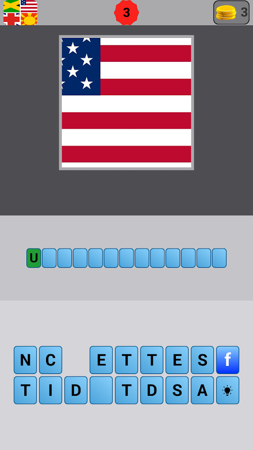 Try to guess the national flags from the close up objects of each flag shown by spelling the name of the country using the lettered tiles given.