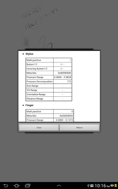 (Device type / maximum multi touch / button(hovering) / pressure stage / pressure range / tilt range / orientation range / distance range, etc...)