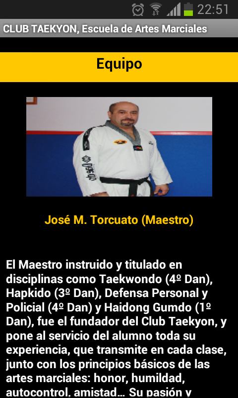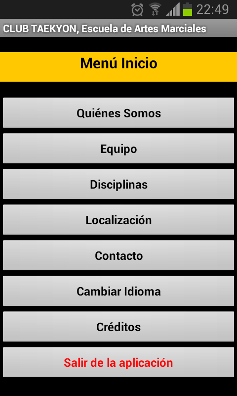 Esta aplicación ha sido desarrollada por ArteWebIndálica, una empresa almeriense de desarrollo y diseño de software y aplicaciones web para PCs, moviles y tablets. Queda prohibido su uso con fines comerciales y la utilización de cualquiera de sus contenidos (textos, imágenes u otros componentes) sin la autorización por escrito del propietario. Parte de la información y documentos gráficos de esta aplicación han sido recogidos de la pagina web oficial de Club Taekyon (www.clubtaekyon.es).This is a corporate application translated in 4 languages (Spanish, English, French and German) Club Taekyon Company, destined to know everything about their business and professional activities.