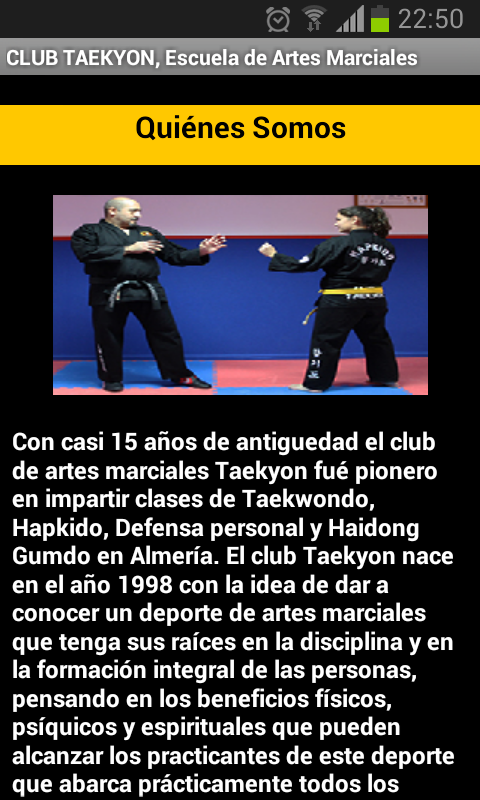With almost 15 years old martial arts club Taekyon pioneered teach Taekwondo, Hapkido, Haidong Gumdo Personal Defense and Almeria. The Taekyon club was founded in 1998 with the idea to provide a martial arts sport that has its roots in the discipline and the integral formation of individuals, considering the physical, mental and spiritual benefits that can reach practitioners This sport covering virtually every country in the world.