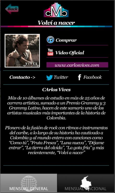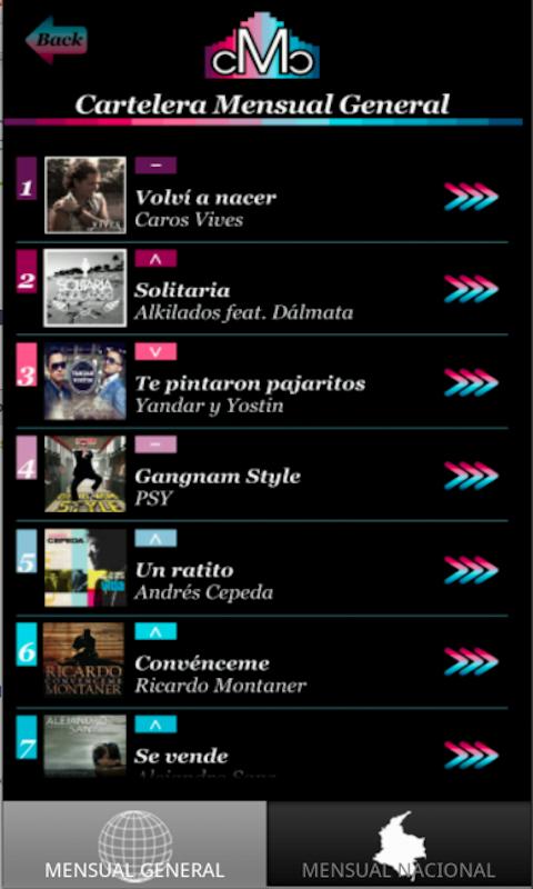 Además de visualizar el ranking, en esta aplicación podrás acceder rápida y ágilmente a información de los artistas y las canciones, encontrando un vínculo directo a YouTube para que veas el video oficial y a iTunes para que la descargues.FREE Download application Billboard Music Colombia (CMC) and stay abreast of the most popular songs!