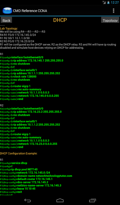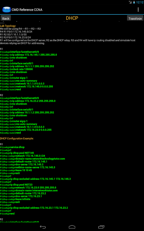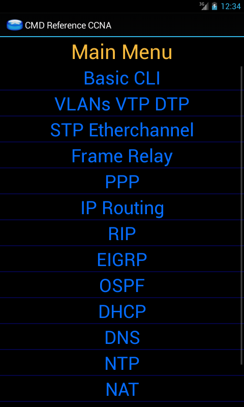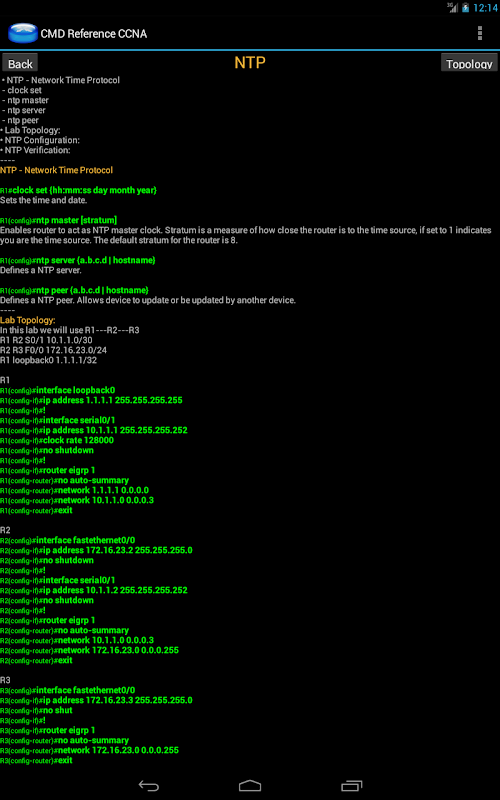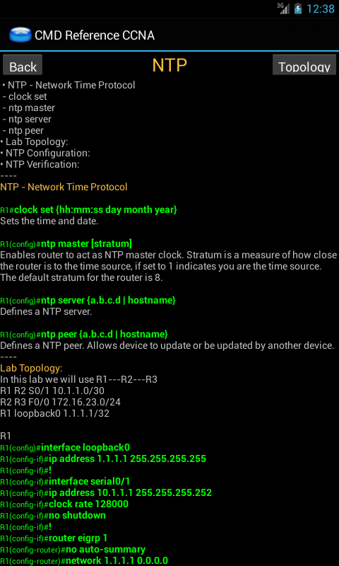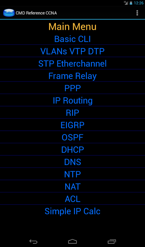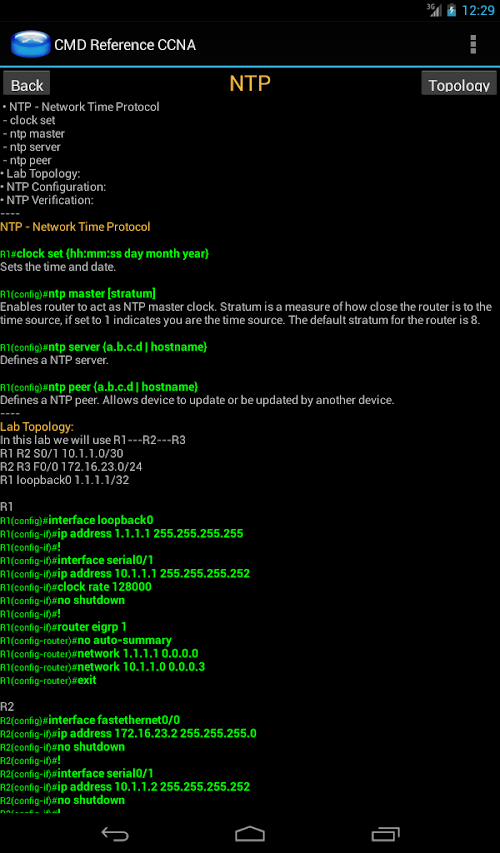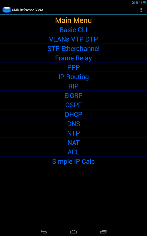 This app was design for quick and easy access to valuable core reference information. It is meant to supplement NOT replace your primary information sources, whether that be via books, videos, classrooms, boot-camps, Cisco documentation, or teachers and mentors. Router IOS commands are based on Cisco IOS 12.4T and Catalyst switch commands are based on Cisco IOS Release 12.2(44)SE. Please consult Cisco's documentation for your particular router/switch model IOS version running in your lab or production environment.