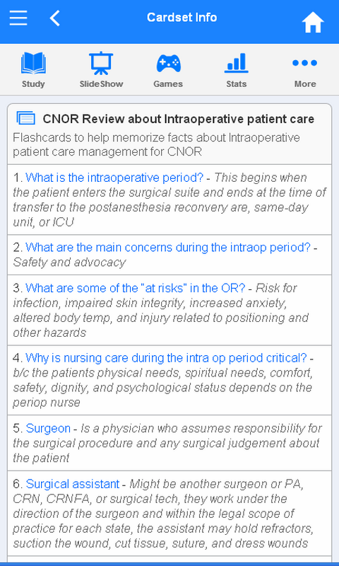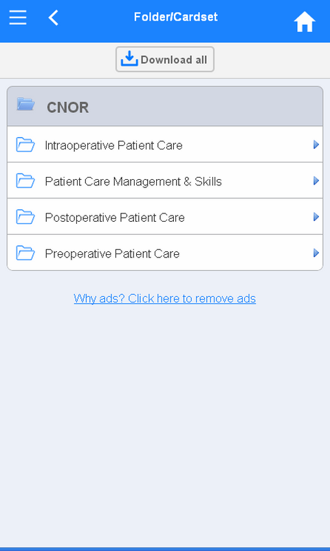 CNOR Flashcards app includes 1400 premade flashcards from 4 categories which cover all aspects of the Certified Nurse Operating Room exam: