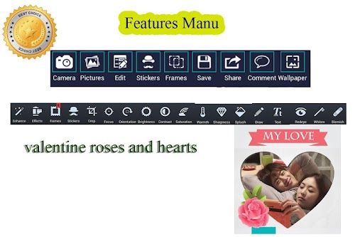 - Photo Frame with Valentine hearts and stickers. Roses in a variety of labels and scalability, rotate and delete images.