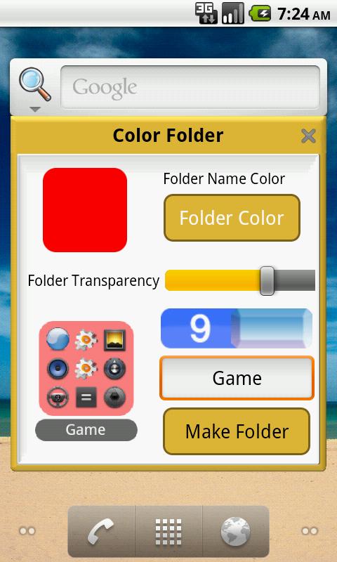 Color, transparency, change for folder of the application, telephone number and bookmark