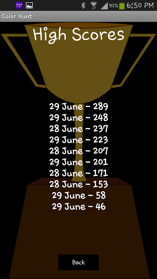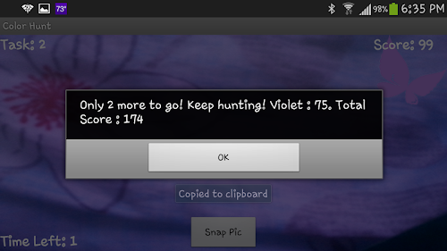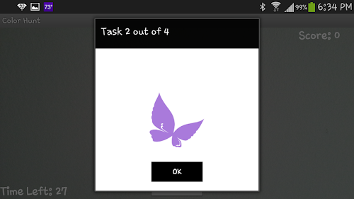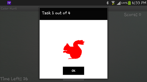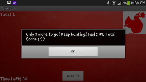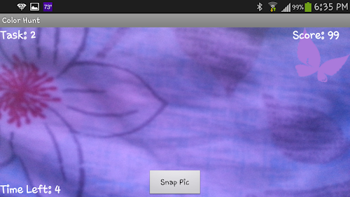 Color Hunt is a fun and interactive exer-game through which you can exercise as you hunt for colors! The goal of this game is to find given olors around you, take a pictiure, and see how yours match. You have a limited amount of time for each color..... So Hunt Hurry!
