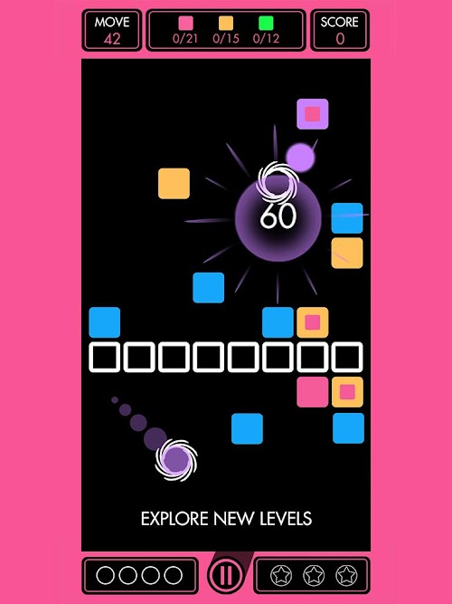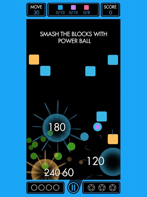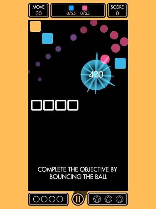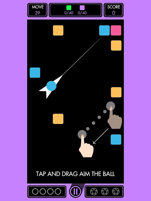 As you progress through the levels, you’ll be offered fewer moves but more colored blocks to deal with, in addition to geometrical wall that bounce your ball in different directions, and even moving blocks which interfere with your ball’s travel. The challenge of the game would be the tricky nature of aiming and firing your ball accurately to make calculated bounces.