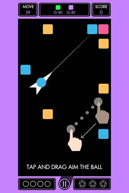 Color Ranger is about color and aiming. Simply tap and drag your finger to aim the ball and adjust your power then release to send the ball flying around the field. When your ball hits a block of a given color, it changes to that color and subsequent hits will break a block of the same color.