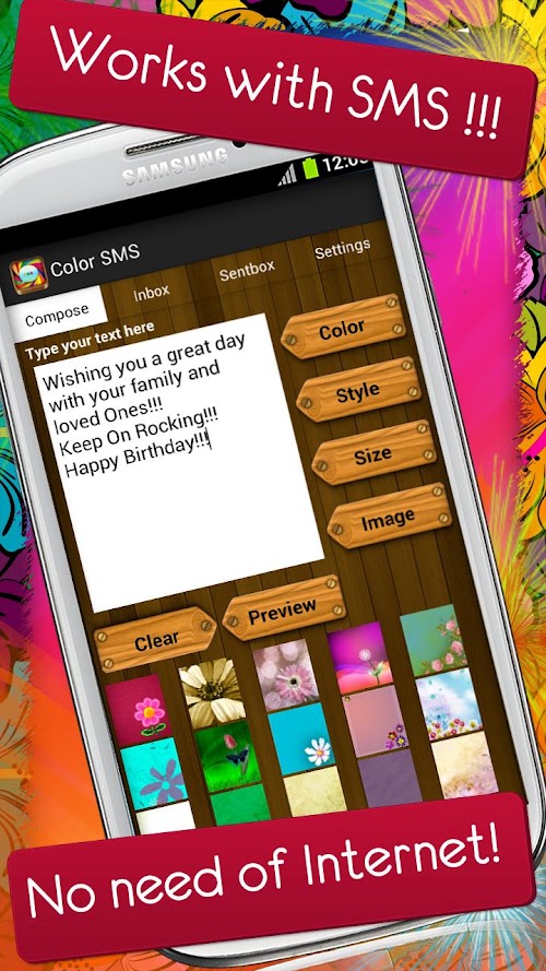 Send Amazing Texts with Color, Font, Size and Backgrounds! No more plain texts anymore! Send the Color message right from the application itself!!