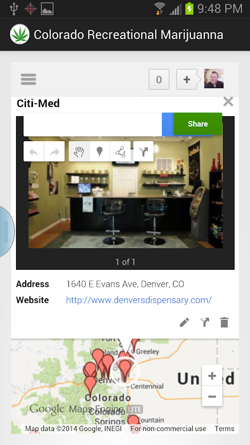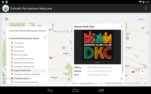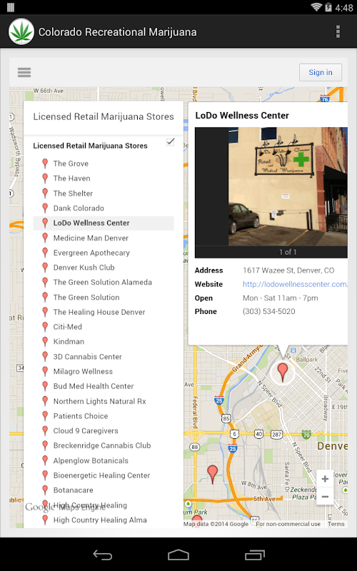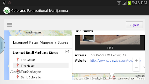 The most up-to-date map of all Colorado Recreational Marijuana Stores on your mobile device! Your guide to all of the Retail Pot Shops in Colorado - not just in Denver but all of Colorado! Updated daily online with no ads or stuff you don't need. Pan, Scroll and Zoom to locate the closest recreational shops to you. Click to see a picture of the store, their website, their hours of operation and their phone number. Updated daily as new shops become licensed and open up. If you get the problem where the list is in the way of the map just log into your Google account with the upper right-hand button on the main screen.