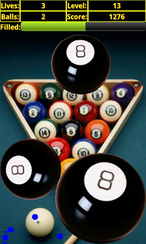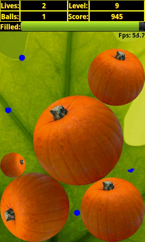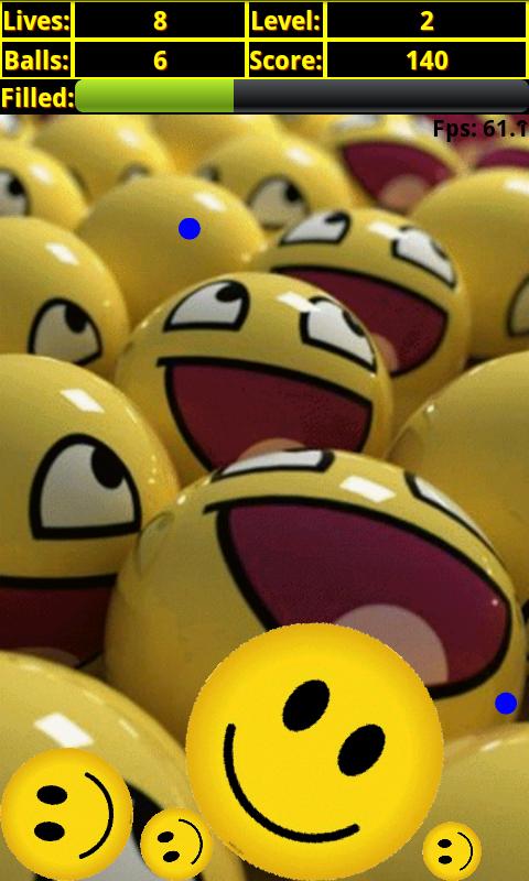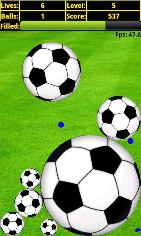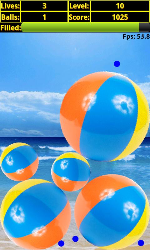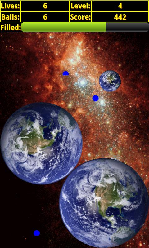 Try to fill up the required percentage of the screen with a limited amount of lives and balls, in various levels and environments. Hold down and drag to create a growing ball in the real 2D physics simulation, but take care to not touch any screen boundary or bouncing ball to not lose a life.