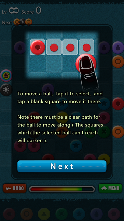 Move the balls around the board to get five of the same color in a line, causing them to be removed from the board. If no balls are removed after a move, more balls will appear on the board. Just challenge a high score before the board is full of balls!