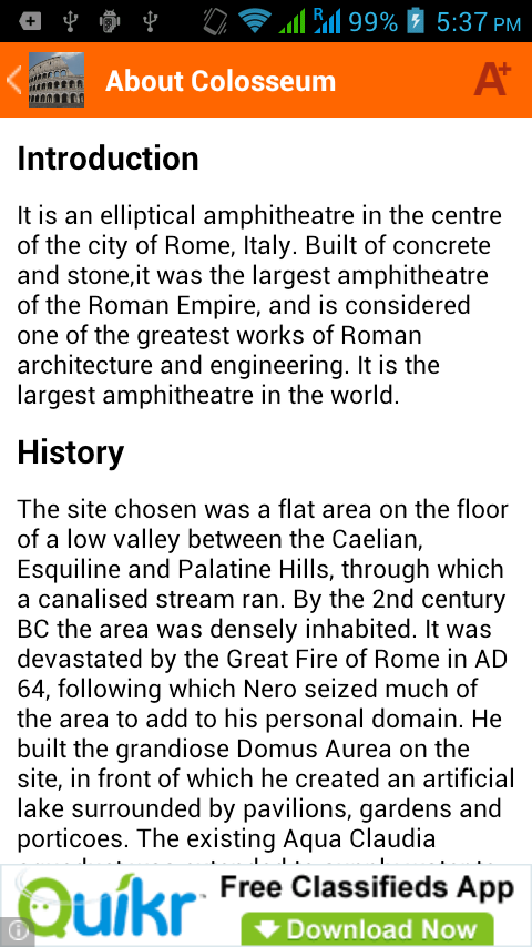 Monuments are the pride of the country they belong to. This Colosseum app will provide you all the details about the famous monument. The Colosseum is situated in Rome, Italy and is is an elliptical amphitheatre in the centre of the city. It is the largest amphitheatre in the world. The Colosseum could hold, it is estimated, between 50,000 and 80,000 spectators and was used for gladiatorial contests and public spectacles.