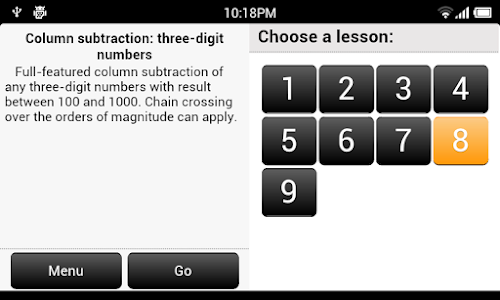 This app consists of 9 lessons; each of them intended to automate a particular calculation skill with column addition and subtraction. Some lessons look simple but they yet are required to understand latter materials.