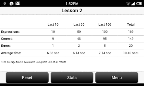 The pupil must correctly answer at least 95% of each lesson in the allowed time. The time allowed for each lesson is determined experimentally and is usually between4 to 9 seconds. This feature may not be altered. The actual readiness is measured for the last 100 results. Once the pupil reaches 95% or more of correct results and the average time is equal or better than required, the lesson readiness becomes 100% and the lesson is marked as completed. At this time the lesson cannot be chosen for practice any more until the user resets the stats for the lesson or does a global stats reset. This way the pupil is not limited by any means and can continue learning anytime. Some pupils will require 200-300 practice problems to complete the lesson and others may require 3000-5000 for the same result. This is fine and nothing to worry about, as it may reflect the type of learner that the pupil is or the amount of initial knowledge on that subject.