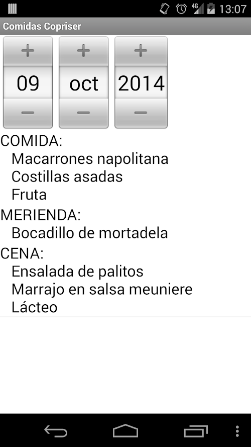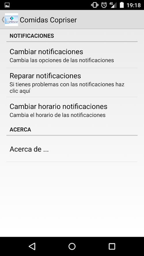 La aplicación envía notificaciones a las 13:30 con la comida de ese día y a las 20:30 con la cena de ese día. Estas notificaciones se pueden configurar para que se muestren sólo en los días de diario, sólo en los fines de semana o en ambos. Además, se puede modificar la hora a la que queremos que nos lleguen ambas notificaciones.Application designed to make the menu for each day of the dorm Benjamín Palencia of Albacete. To use it you just have to select the day you want to know and we will get down menu that day. It is also valid for other residences belonging to the enterprise Copriser.