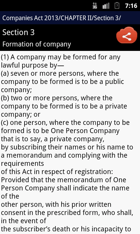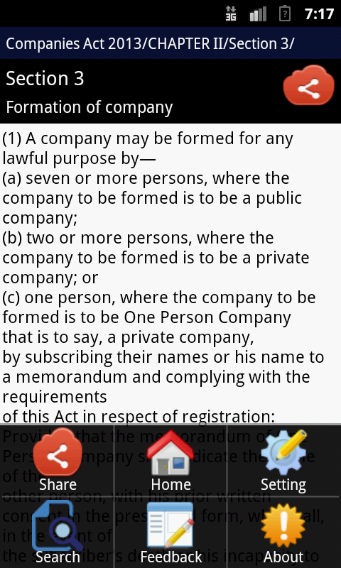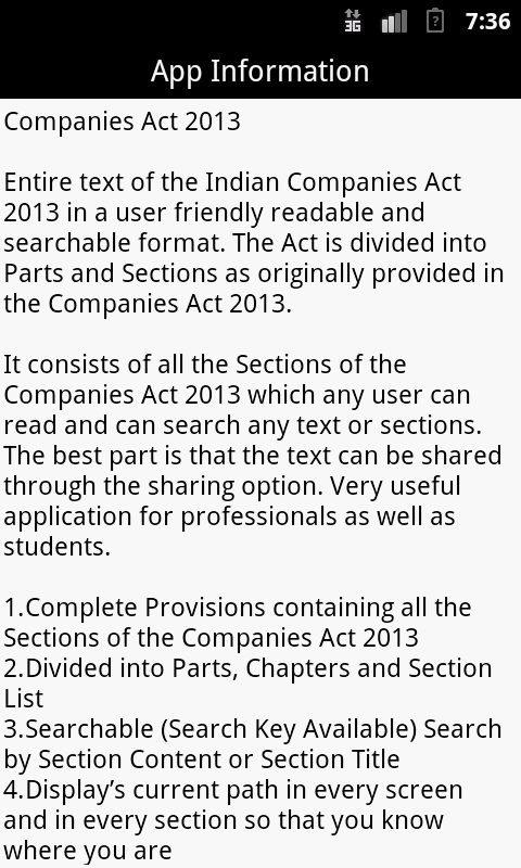 The Act is divided into Chapters, Parts and Sections as originally provided in the Companies Act, 2013. It consists of all the Sections of the Companies Act, 2013 which any user can read and can search any text or sections. The best part is that the text can be shared through the sharing option. Very useful application for professionals as well as students.