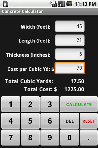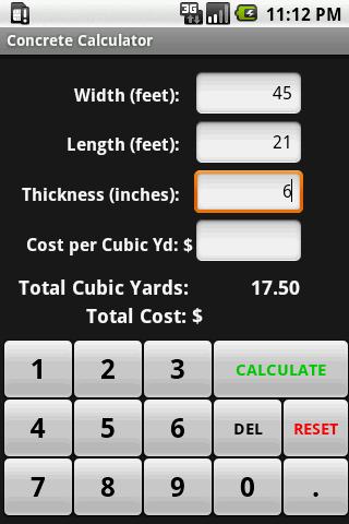 This handy utility lets you calculate the required number of cubic yards for a slab. Just enter the length, width, and thickness and hit CALCULATE. Also includes a field for entering the cost per cubic yard to calculate the cost of the job.