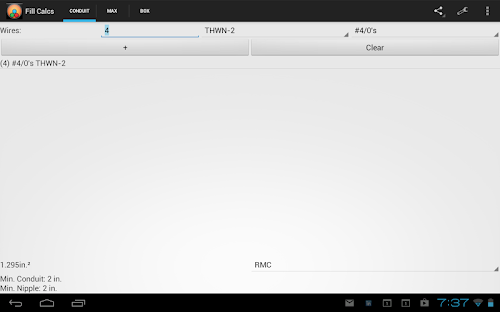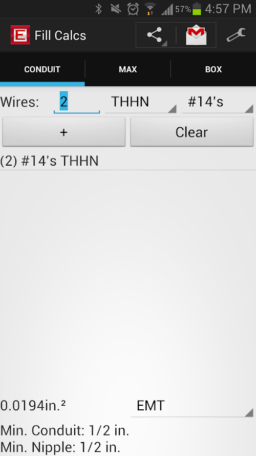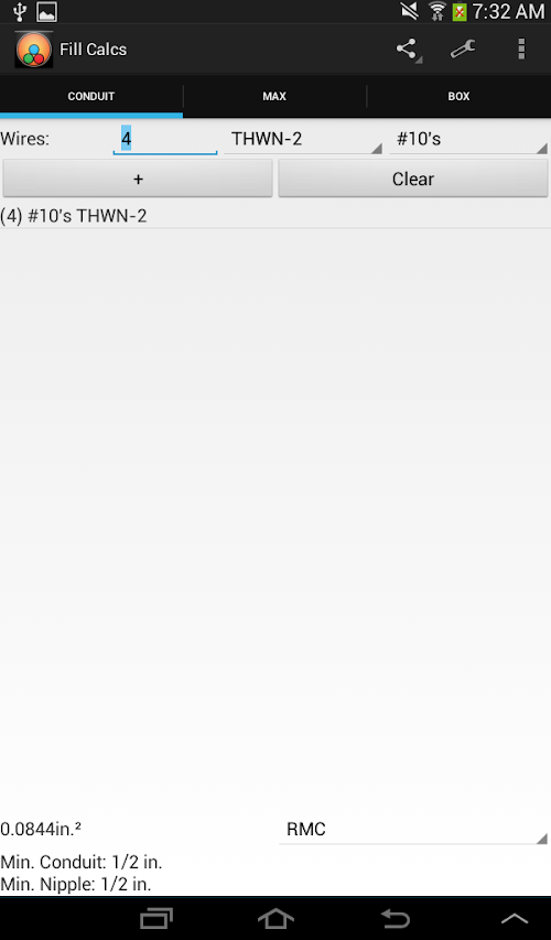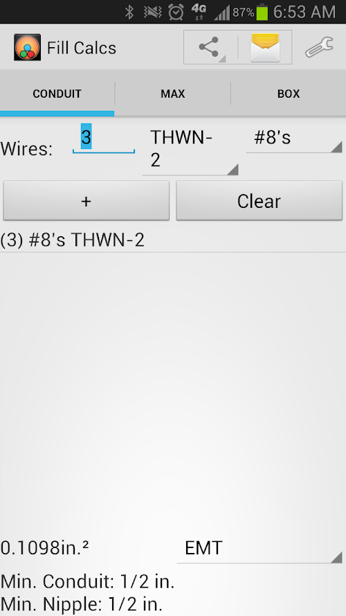 This app will calculate the conduit fill based on the inputted wires and conduit type. The calculations can then be shared via email, text etc.