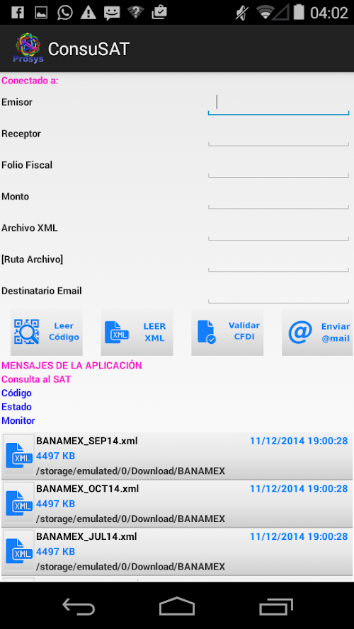 3. Extracción de la información tomando el archivo XML que se encuentre en la memoria interna del dispositivo.