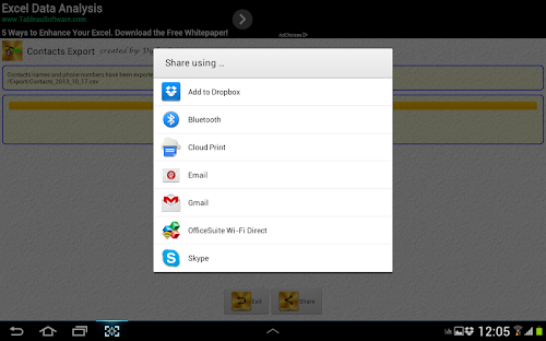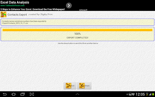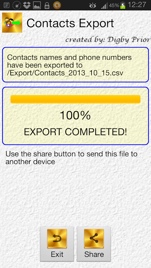 Use the share button to get a copy of the export file (as a backup of your contacts) off your phone.