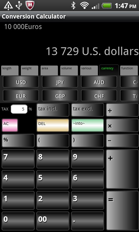 Please input “15”, then tap the button of “EUR” and press” =”, then you will find the latest currency exchange rate of 15EUR in JPY.