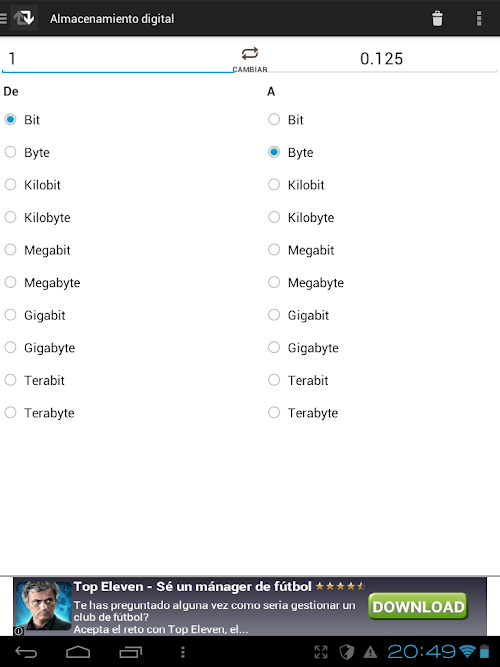 Con una moderna interfaz y elementos de configuración, esta aplicación puede ser su mayor aliada para convertir magnitudes.This application lets you easily convert units: