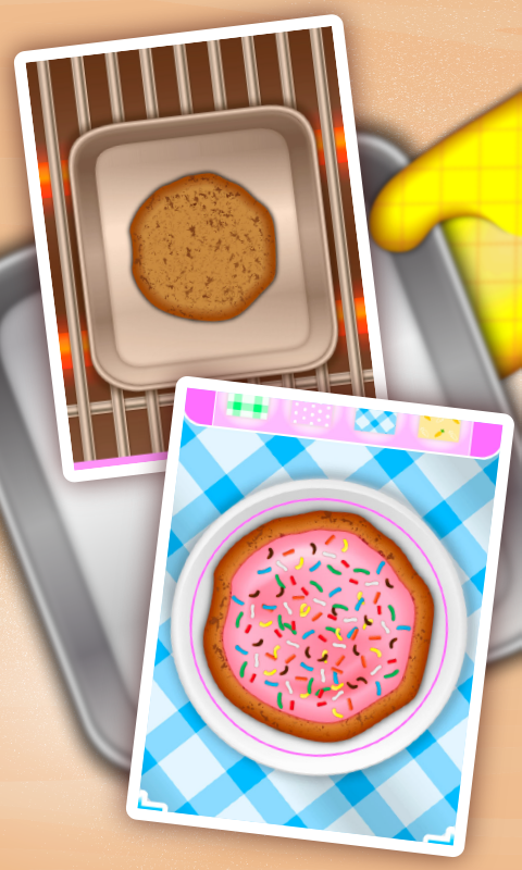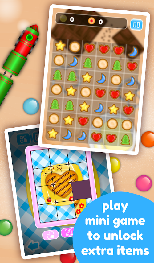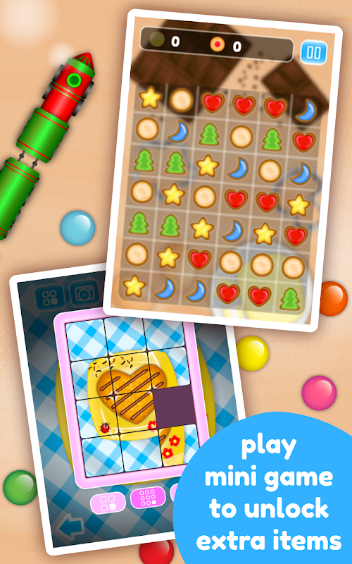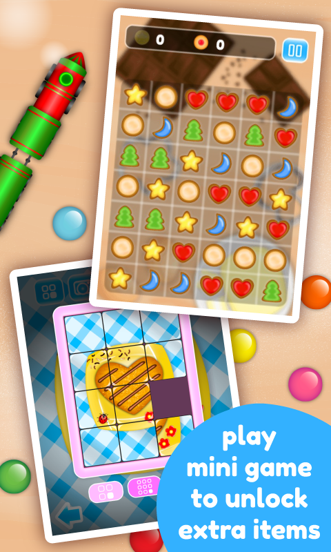 At the end of this great cooking game you can add some toys and start the fun! Eat your delicious cookie, play with your favorite toy and have fun with a slide puzzle or Cookie crush minigame.