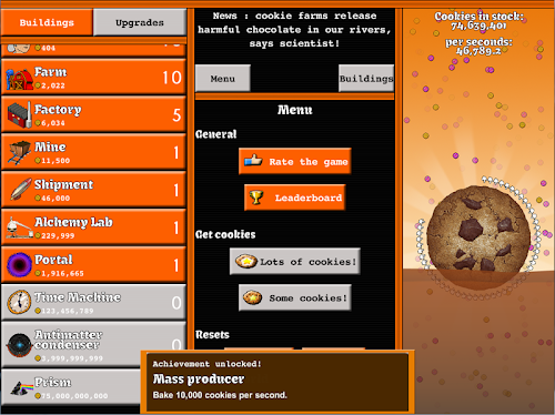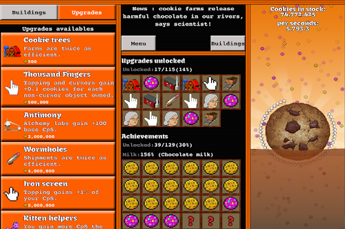 Get your CpS production (Cookies Per Seconds) the highest possible. Unlock more than 100 achievements and upgrades. Reset the game to get heavenly chips which will boost your cookie production.