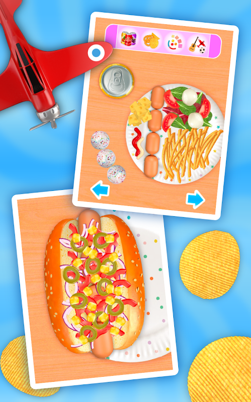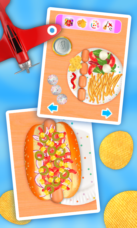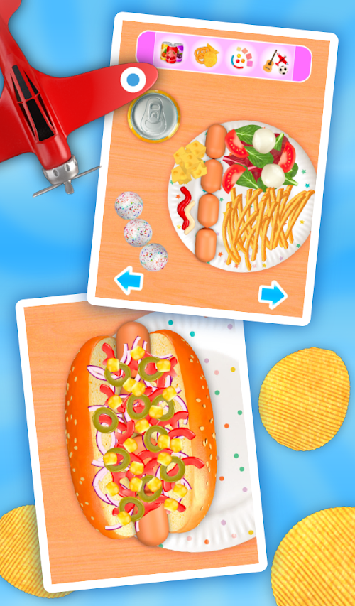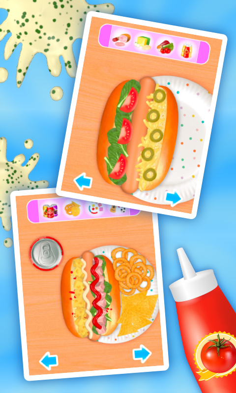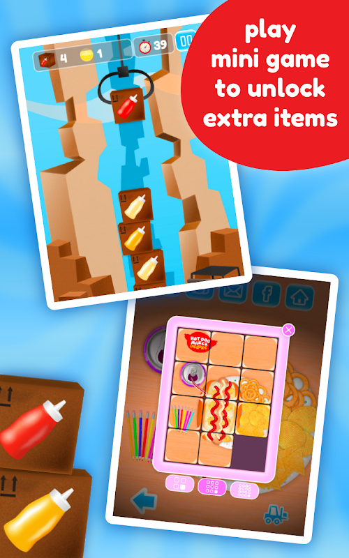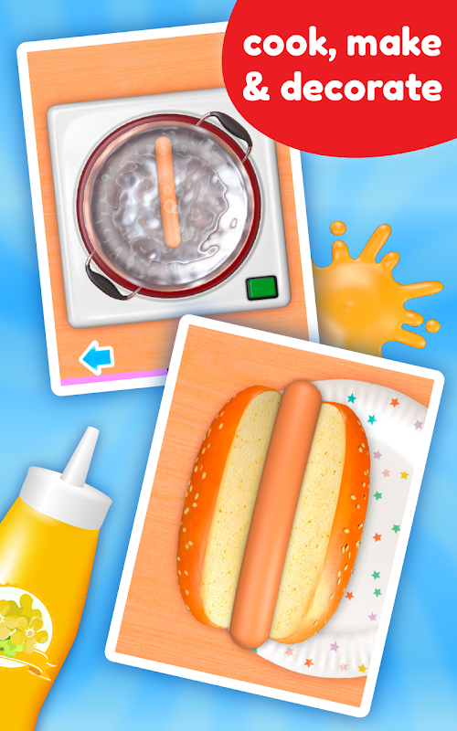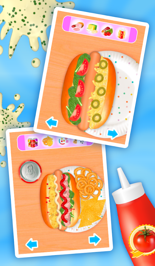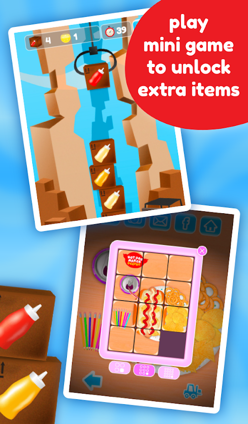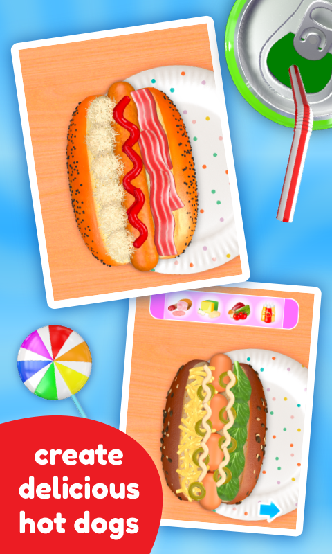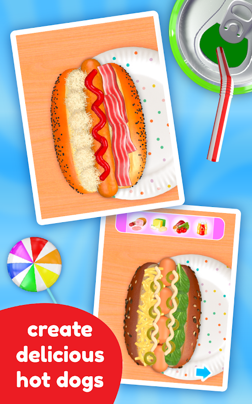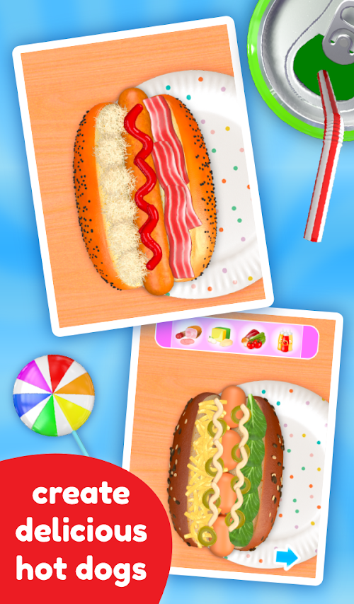 Make the BEST Hot Dog ever! Serve this great fast food with toppings, crispy snacks and a refreshing drink. Eat it and play with toys or take a challenging tower building minigame.