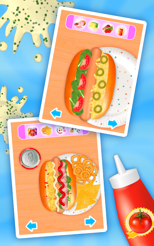In this great cooking game Hot Dog Maker Deluxe, there’s a huge selection of ingredients with which you can create a hot dog of your dreams. Chose the sausage you like, cook it and then put it in your favourite bun. Decorate your hot dog with vegetables, add some sauces and spices, then serve it with a drink, crispy chips and fries. At the end, you can also add some candies and toys to play with while eating your delicious meal.