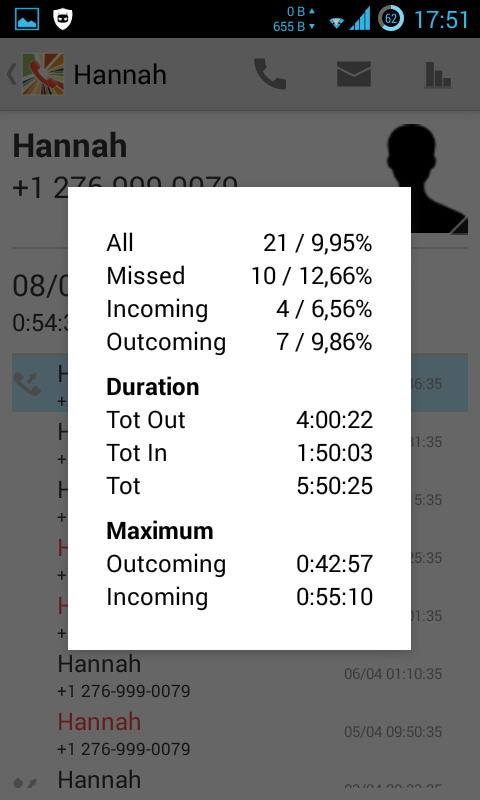 Max incoming and outgoing duration call time per contact