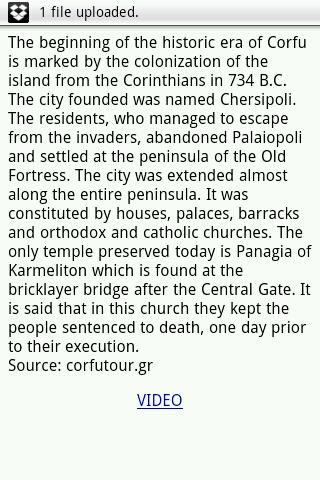Corfu Tour Guide presents various places of Corfu island as points on Google Maps. Moreover, it offers multimedia information (text and video) about the places and social media support.
