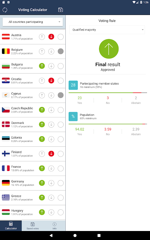 The voting calculator app is a must-have for anyone following meetings of the Council of the EU, its working parties or Coreper. The voting calculator makes it easy to check if a qualified majority has been reached, anytime, anywhere.