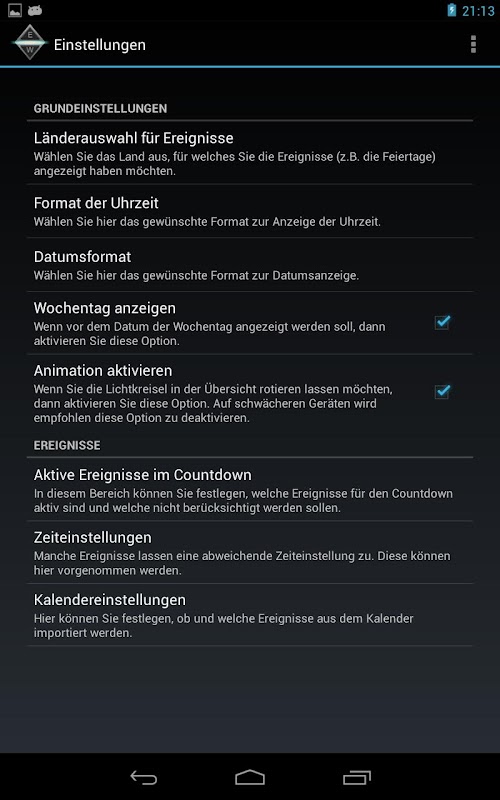 In der Ereignisübersicht werden zusätzlich alle weiteren Feiertage des ausgewählten Lands dargestellt, von Mariä Himmelfahrt über St. Josef bis hin zum Heiligen Nikolaus. Ab Version 1.3.0 können diese Ereignisse auch für das Countdown-Widget verwendet werden.