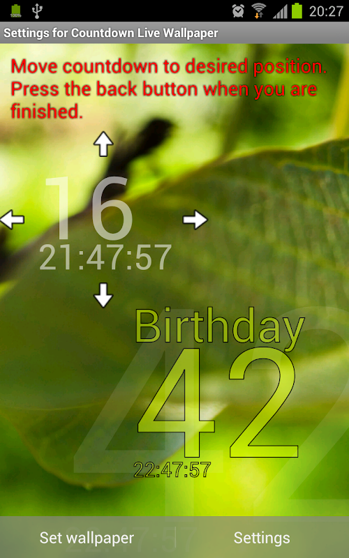 To use this wallpaper, press the menu-button when you are on your home screen. Choose “Wallpaper” -> “Live wallpapers” and select the “Countdown Live Wallpaper” from the list. You can change your settings and set it as your new wallpaper now.