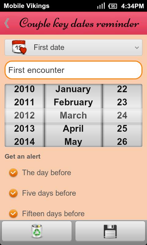 Couple key dates reminder is the best way to avoid forgetting important moments of the relationship you have with your partner. From your first date to valentine’s day through his or her anniversary or any date you wish to remember, this application will ensure you that you will have the time to do something special.