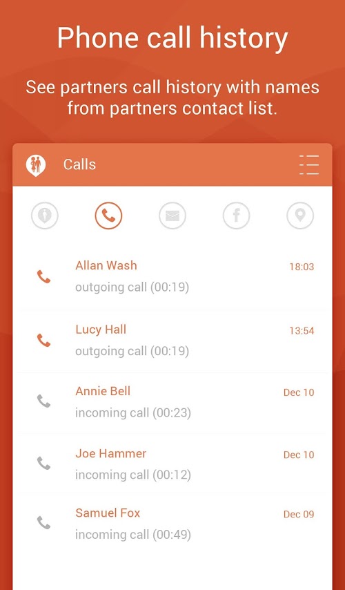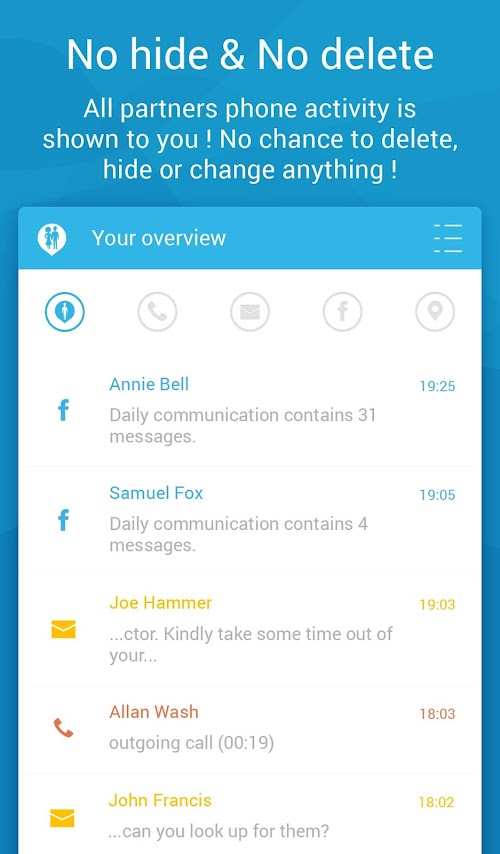 ✔ Delete prevention - deleting text messages or calls won’t help - Couple Tracker is faster ;) It is not possible to hide activity or remove communications (Texts, Phone calls, Location or Facebook).