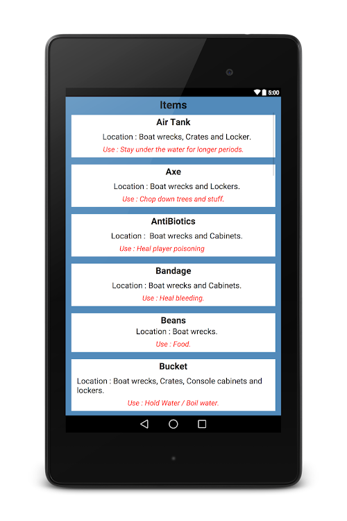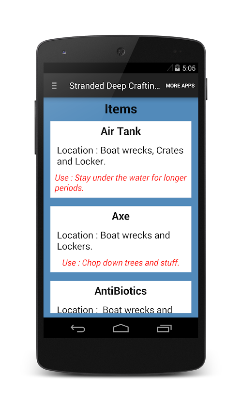 The app is a must have companion for your journey in the Stranded Deep game. This will help you with the game basics, crafting things and buildings, find items and some handy tips.