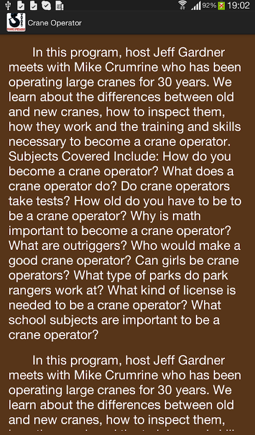 In this app, host Jeff Gardner meets with Mike Crumrine who has been operating large cranes for 30 years. We learn about the differences between old and new cranes, how to inspect them, how they work and the training and skills necessary to become a crane operator. Subjects Covered Include: How do you become a crane operator? What does a crane operator do? Do crane operators take tests? How old do you have to be to be a crane operator? Why is math important to become a crane operator? What are outriggers? Who would make a good crane operator? Can girls be crane operators? What type of parks do park rangers work at? What kind of license is needed to be a crane operator? What school subjects are important to be a crane operator?