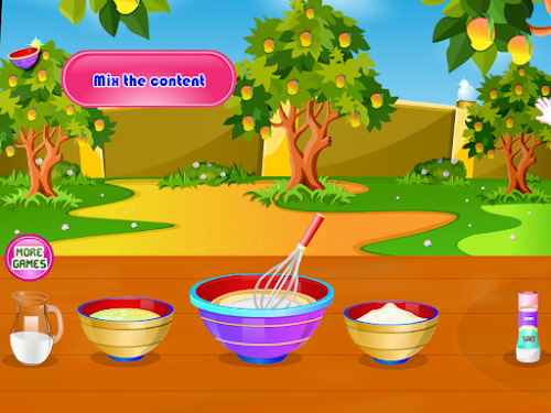 1) At the beginning of the game you have to go shopping and buy everything that you need. The ingredients are hiding among the trees and you will have to collect them. Ingredients and utensils that you will need to obtain are: lemon juice, mixer, whisk, pan, flour, sugar, oil, water and butter;