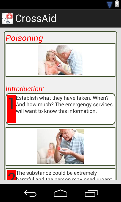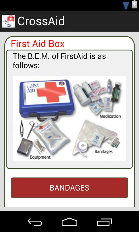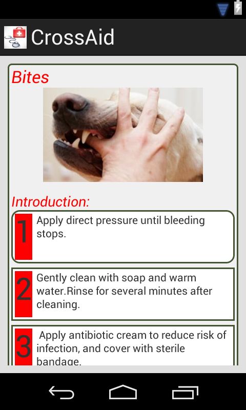 CrossAid is a simple and easy to understand first aid application. It consists of emergency remedies for trating people in stress, allergies, asthma etc. This application also contains steps to treat animals in distress.