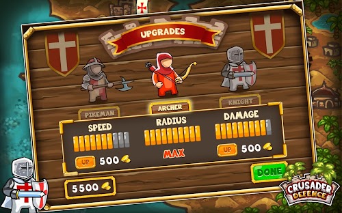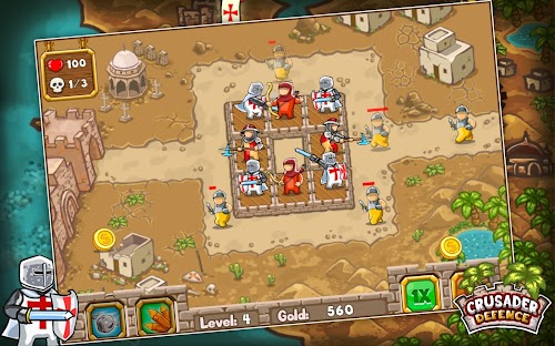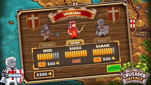 As you play through the game, you’ll also notice there are coins to be found in each level. Grab as many as you can, as these coins can be spent in the Crusader Defense Shop on new upgrades! Upgrade the speed, radius, and attack of your units and your weapons for maximum damage! You can also get bonus weapons such as pitfalls – guaranteed to stop any invaders in their tracks.