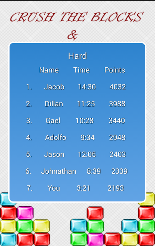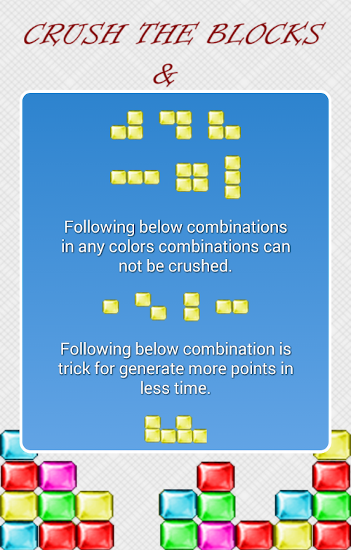 Show your talent through crushes the blocks with maximum combinations and generate more points in less time and top other game users.it can help you for improve memory power and also improvise in keeping himself alert.