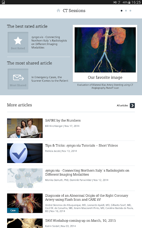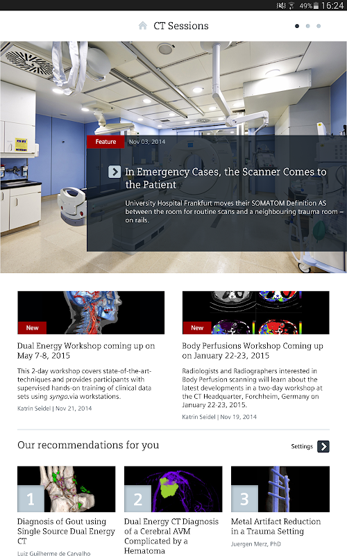 Siemens Computed Tomography Customer Magazine brings you the latest innovations, clinical applications, and visions in computed tomography. This app allows you to access all articles and download them to read offline. Based on your interests you can receive personal recommendations, or you have a look at the articles that have been most shared and best rated by the readers.