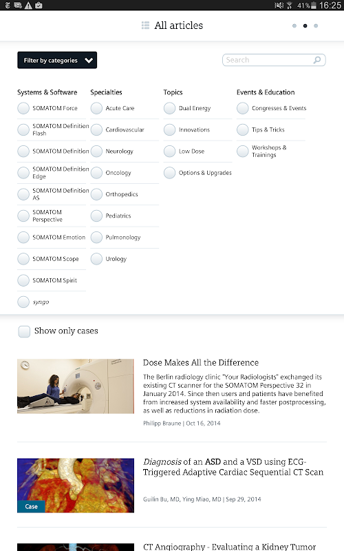 Siemens Computed Tomography Customer Magazine brings you the latest innovations, clinical applications, and visions in computed tomography. This app allows you to access all articles and download them to read offline. Based on your interests you can receive personal recommendations, or you have a look at the articles that have been most shared and best rated by the readers.