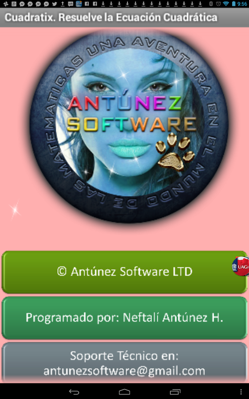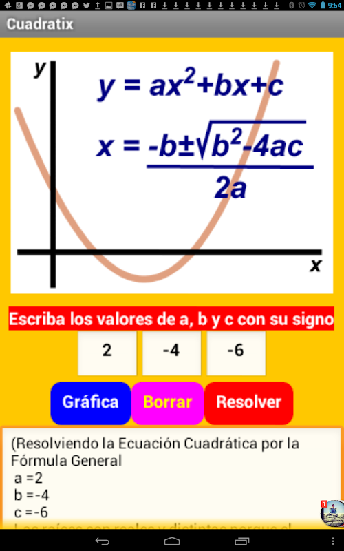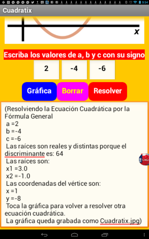 Aplicación para Smartphones y Tablets para resolver la ecuación cuadrática. Halla todas sus raíces reales y complejas. Hace su gráfica y la graba como imagen jpg. Habla todos los resultados.Application for Smartphones and Tablets to solve the quadratic equation. Find all real and complex roots. Its graphic ago and saved as jpg image. Talk all results.